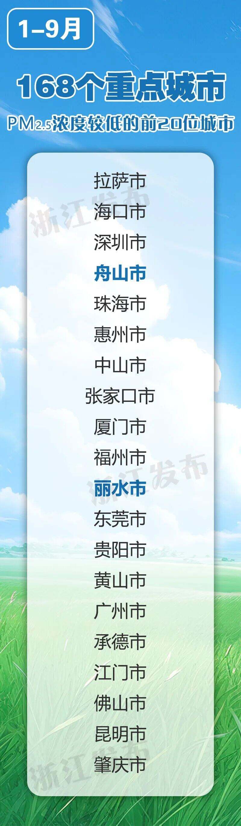1-9月,168个重点城市中,PM2.5浓度较低的前20位城市浙江占2席,分别是舟山和丽水。