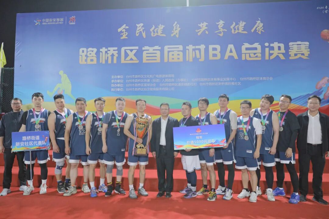 本届村BA以“全民健身、共享健康”为主题,不仅为基层篮球爱好者搭建了交流竞技的平台,更点燃了群众的全民健身热情。自9月中旬总决赛启动以来,来自各镇(街道)的优秀代表队为全区群众带来25场精彩对决。最终,新桥镇华章村代表队斩获季军、金清镇卷桥村代表队斩获殿军,路北街道锦泰社区代表队、横街镇横街居代表队分获第5、6名。