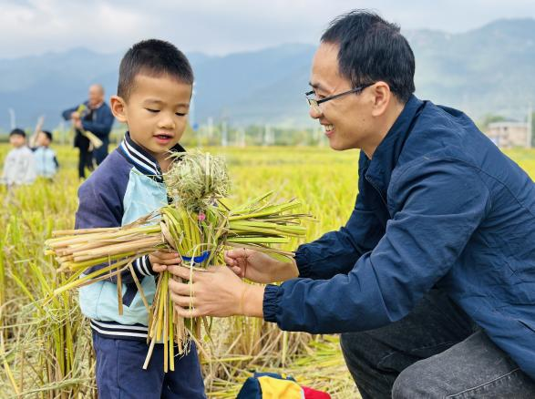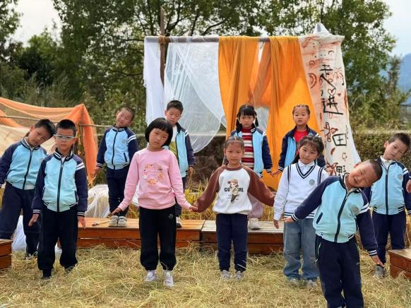 稻田音乐会是本次活动的高潮,孩子们与家长们共同布置的舞台在稻田中显得格外亮眼。背景布上的泥染图案、稻秆花束和稻草人等,都是亲子合作的成果。当孩子们站在这个被稻香环绕的舞台上,用亲手制作的稻秆乐器敲击出清脆的节奏,以欢快的手势舞传递温暖与感恩时,整片稻田仿佛都随着他们的表演轻轻摇摆。家长们坐在稻浪簇拥的观众区,眼里满是欣慰与骄傲,掌声和笑声随着秋风在田野间飘荡,将丰收时节的喜悦酿成最动人的记忆。