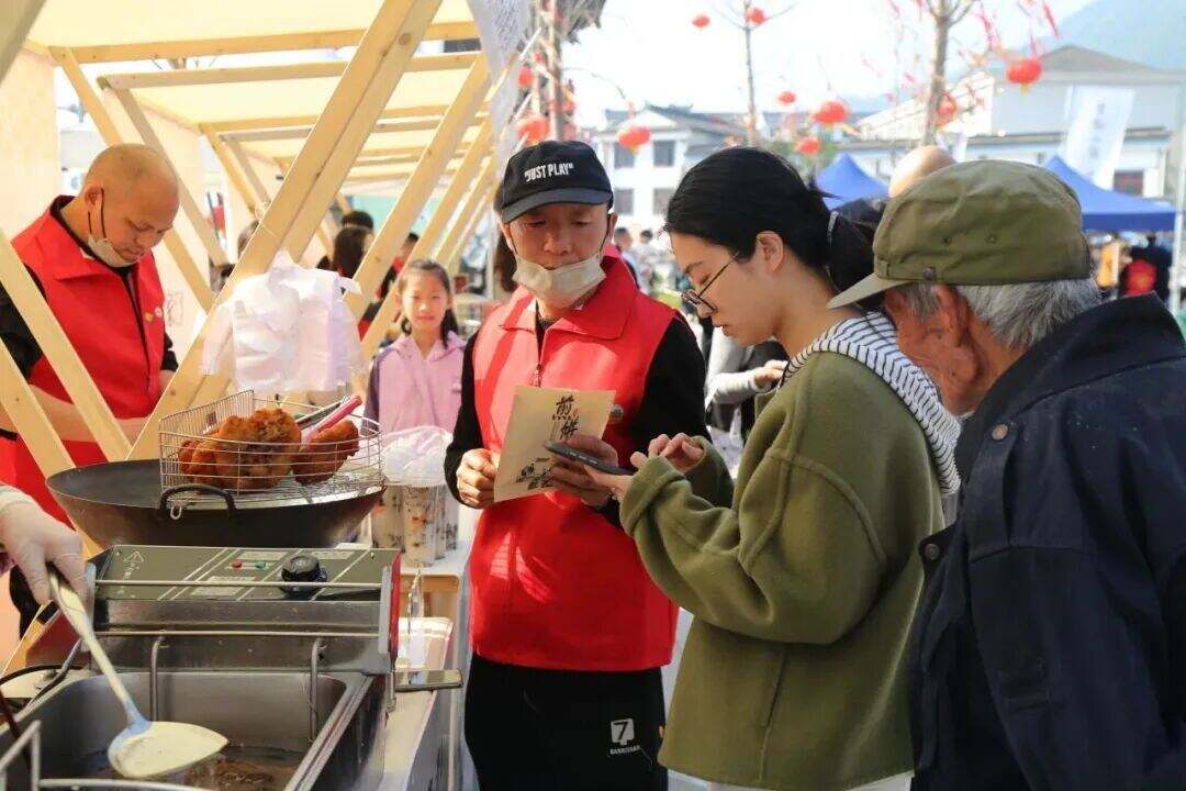 小吃区里,临海泡虾摊主戴师傅的摊位前排起长队。他手持铁勺,将裹满鲜虾、肉末的面糊滑入油锅,油花翻腾间香气四溢。“我卖泡虾十几年了,以前推三轮车路边卖,风吹日晒不说,一天最多赚几百块。”戴师傅说,加入共富市集后,他每天多备三成食材,客流量翻了好几倍。