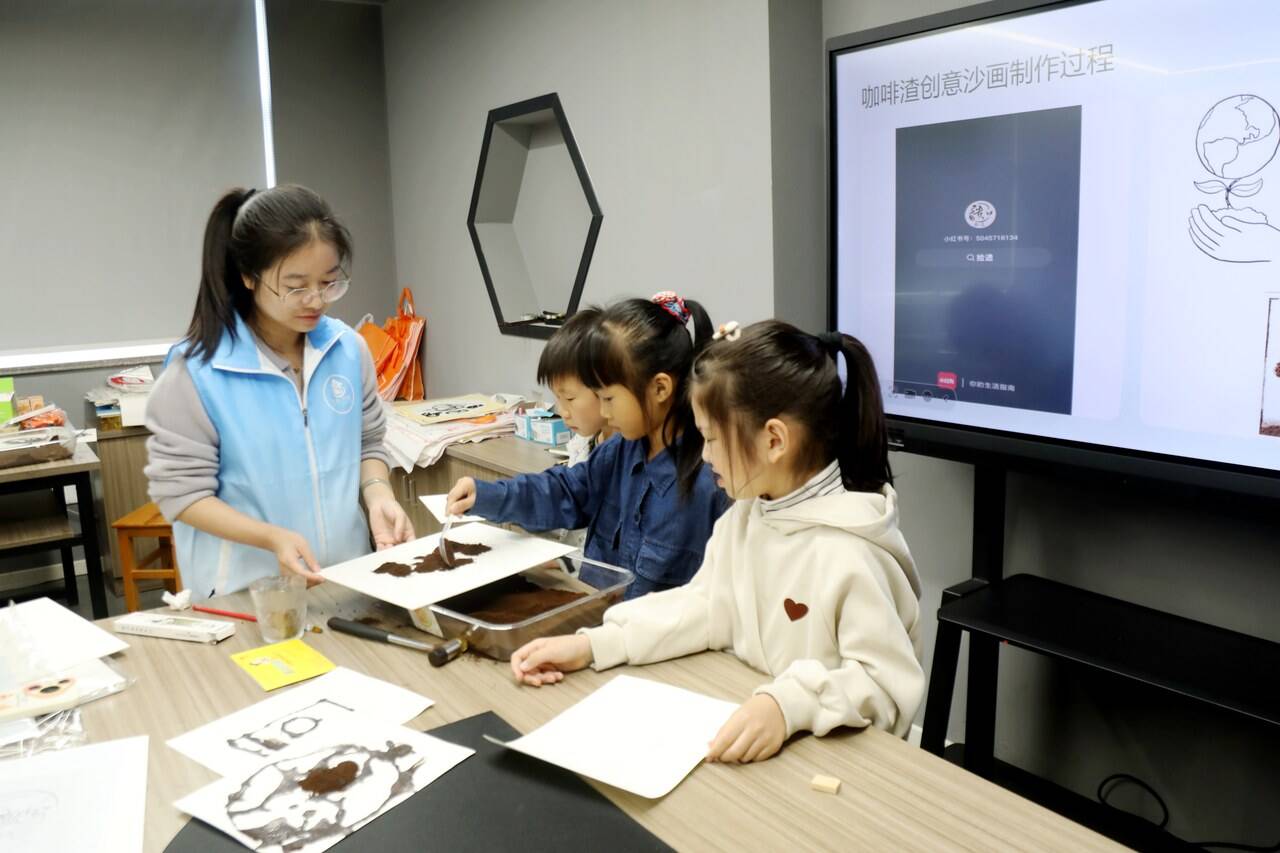 活动伊始,社工结合世界儿童日主题,向孩子们阐释气候担当的意义:“今年世界儿童日,我们都来做气候行动者。这些看似无用的咖啡渣,正是我们践行低碳的小工具,循环利用它们,就是在为地球气候改善出力。”随后,社工展示了干燥咖啡渣的处理方法和沙画创作技巧。