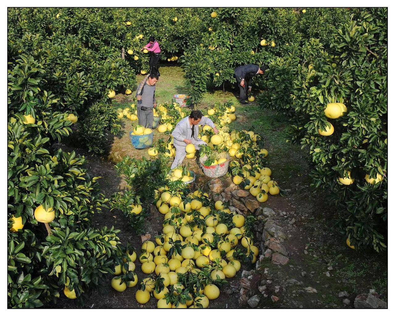 秋日的玉环市樟岙村,连绵的文旦林里缀满了金黄饱满的果实,果农们正在忙碌地采摘、分拣、打包。