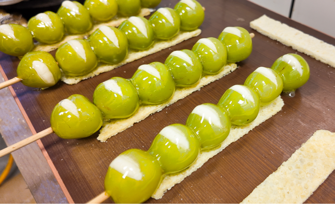 店里的爆款 “晴王葡萄冷萃酸奶奶皮子糖葫芦”,光听名字就让人心生期待。细腻浓稠的酸奶裹着清甜的晴王葡萄,外层是厚厚的奶皮子,双重奶香交织着冰糖的甜脆。