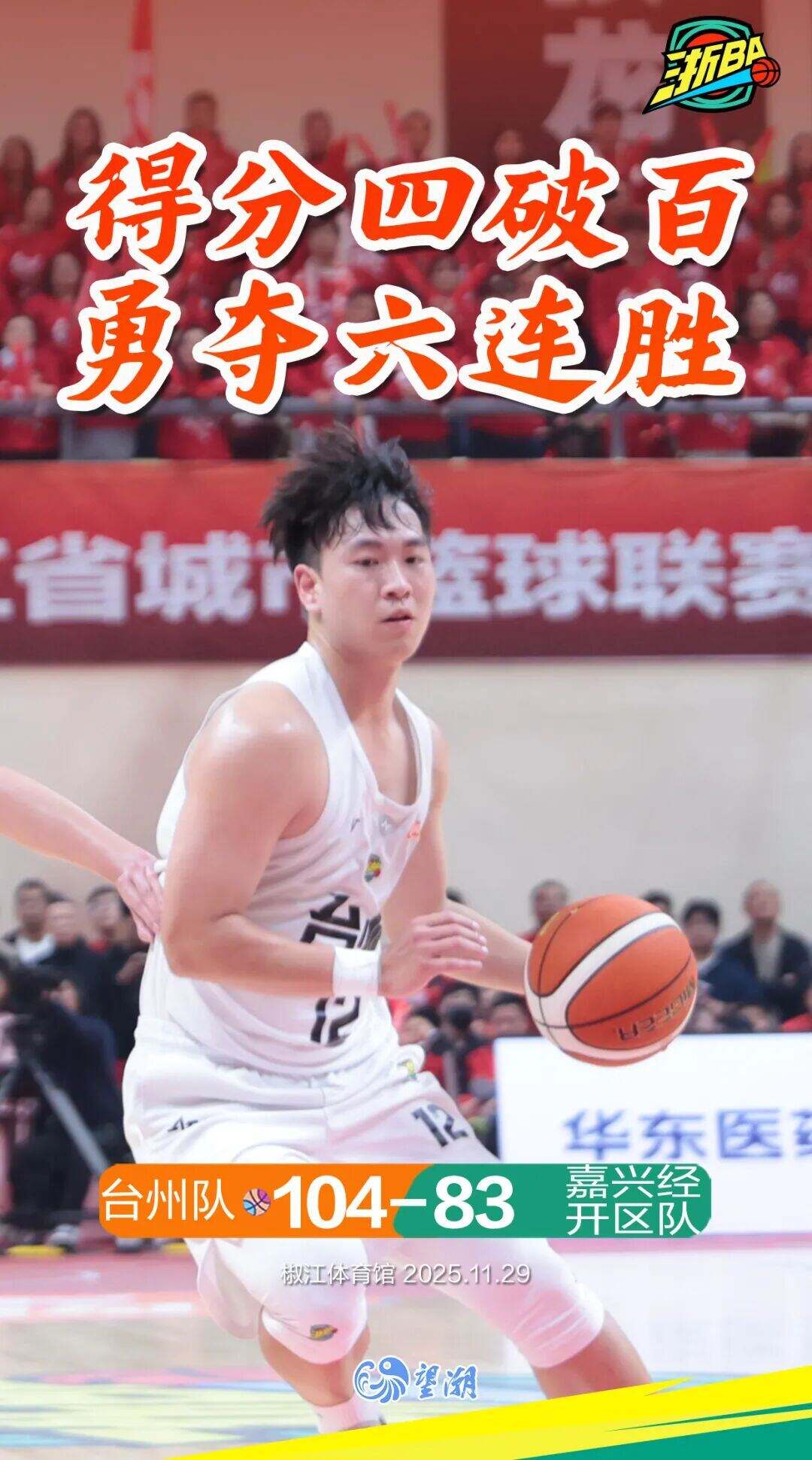 昨晚,浙BA城市争霸赛赛场上台州队主场对阵嘉兴经开区队场上你来我往,看点十足台州队默契配合,多点开花以104:83锁定胜局得分连续四次破百,豪取六连胜。