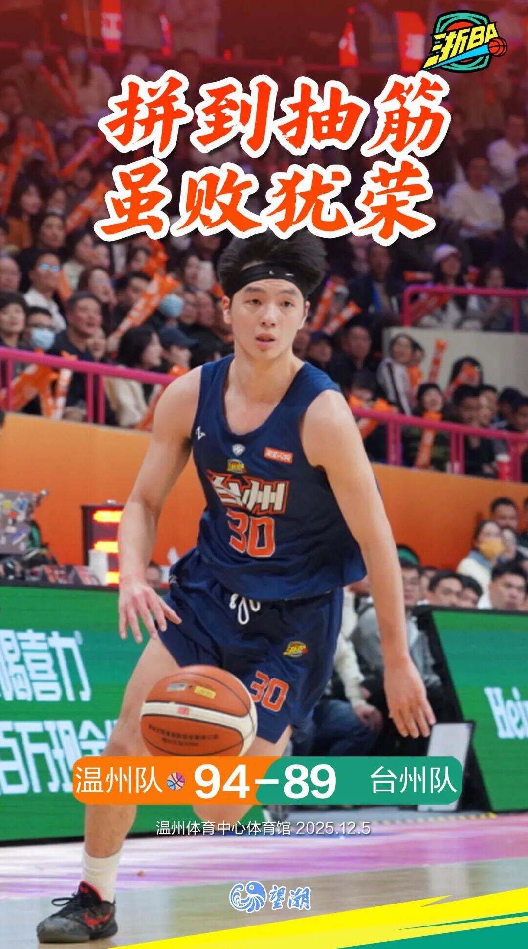 在全场大部分时间紧咬比分、甚至数度反超的情况下,台州队最终以89比94惜败于对手。温州队凭借此战锁定15连胜,并提前晋级八强,而台州队用拼搏赢得了对手的尊重与全场观众的敬意。核心球员徐梓凯、金子淏在最后时刻先后拼至腿抽筋离场的画面,更是成为今夜体育精神最真实的注脚。