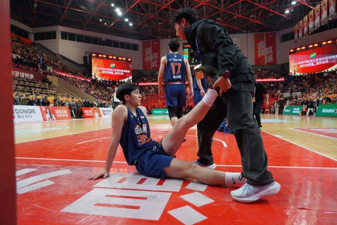 决定性的第四节,徐梓凯命中三分,金子淏随即上篮得手,71平!比赛重回同一起跑线。随后,温情一幕上演:徐梓凯在一次拼抢后痛苦倒地,出现抽筋状况,温州队队员主动上前协助拉伸缓解,现场响起热烈掌声,“温台情谊”与体育精神在此刻闪耀。
