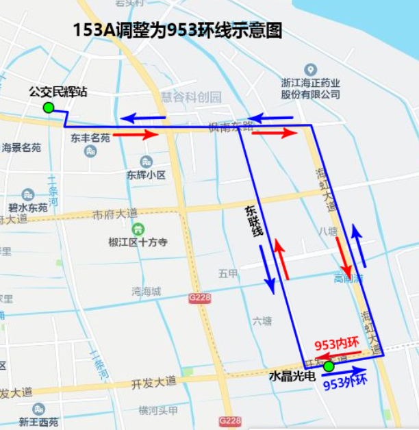 外环:公交民辉站、东丰路口、东丰村部、三条桥头、台州人才城、宏达轻纺、强鹰集团、华侨农业园区、东联线东海大道口、三甲建设村、三甲建设村部、水晶光电、海虹大道东海大道口、义乌创业园、枫南东路海虹大道口、台州人才城、三条桥头、东丰村部、东丰路口、公交民辉站。