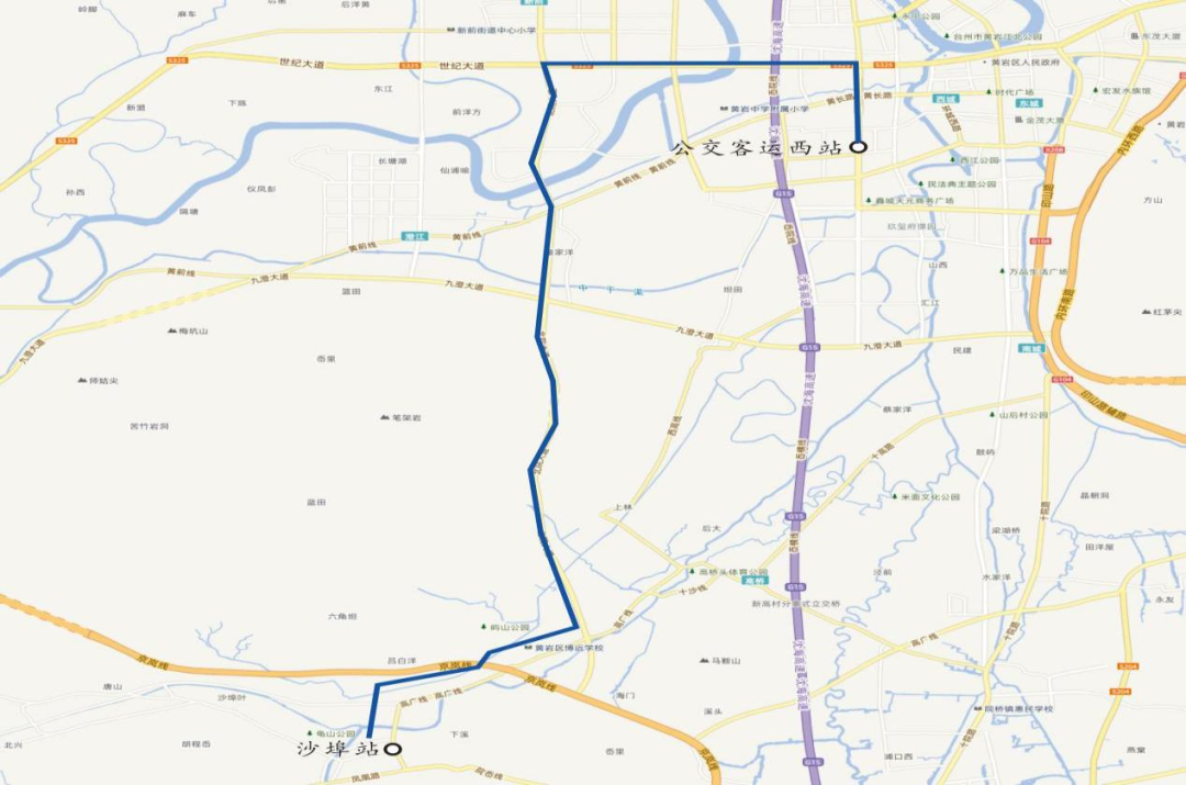 上行:沙埠车站、宏广公司、瓦瓷窑、三童岙村岙口、三童岙村岙里、凉棚岭村西、澄东村、宁江明月翠屏苑、宁江明月锦溪苑、宁江明月、城新广场、黄岩区中医院、梅园新村、公交客运西站