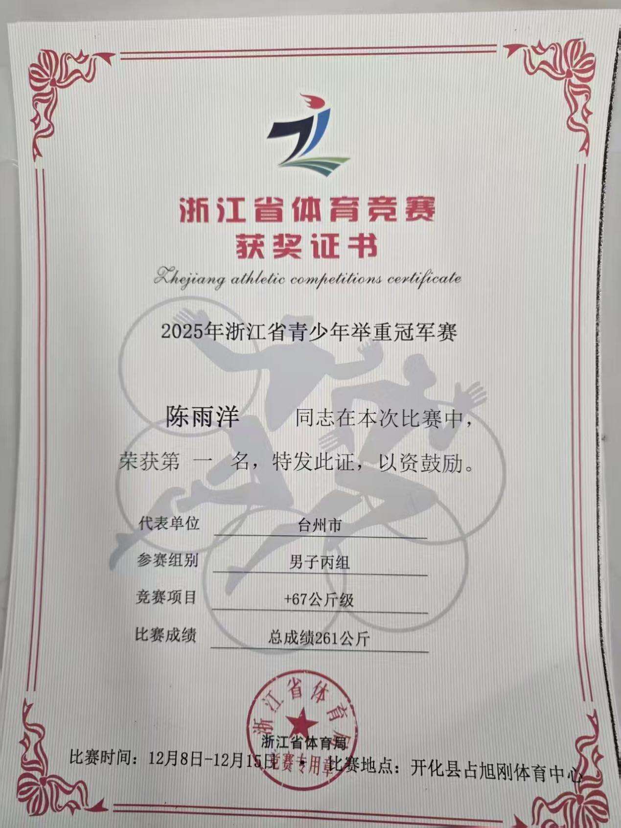 12月12日—15日,2025年浙江省青少年举重冠军赛在开化县占旭刚体育中心举行,在举重男子67公斤级+比赛中,来自台州的选手陈雨洋以抓举116公斤(第一名)、挺举145公斤(第二名),总成绩261公斤获得金牌。