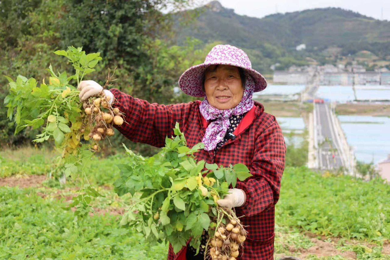 12月14日,冬日的暖阳洒进山谷,温岭市坞根镇红山村的高标准大棚里,农户程继宝和老伴正俯身忙碌。他们轻轻捧起一株秧苗,根系上缀满鹌鹑蛋大小、圆润饱满的黄皮土豆。“别看它小,这可是咱的‘金豆豆’!”