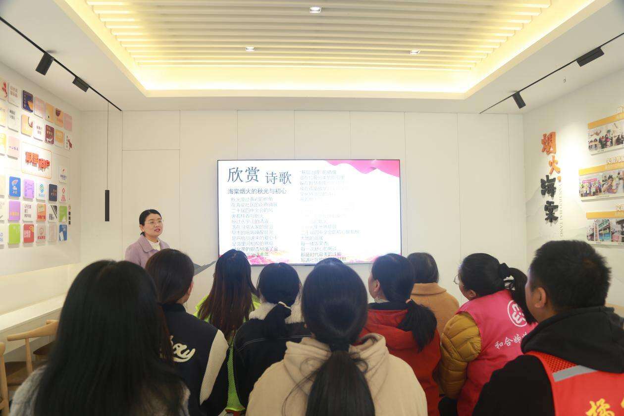 一首原创诗歌《海棠烟火的秋光与初心》为活动拉开序幕,在牟茜茜的带领下,现场群众共同展开品读鉴赏。舒缓的配乐中,大家或轻声跟读,或静心体悟,诗句里海棠社区的秋日景致、市井烟火与基层工作者的初心使命,让在场每一个人都产生强烈情感共鸣,现场气氛庄重而温馨。