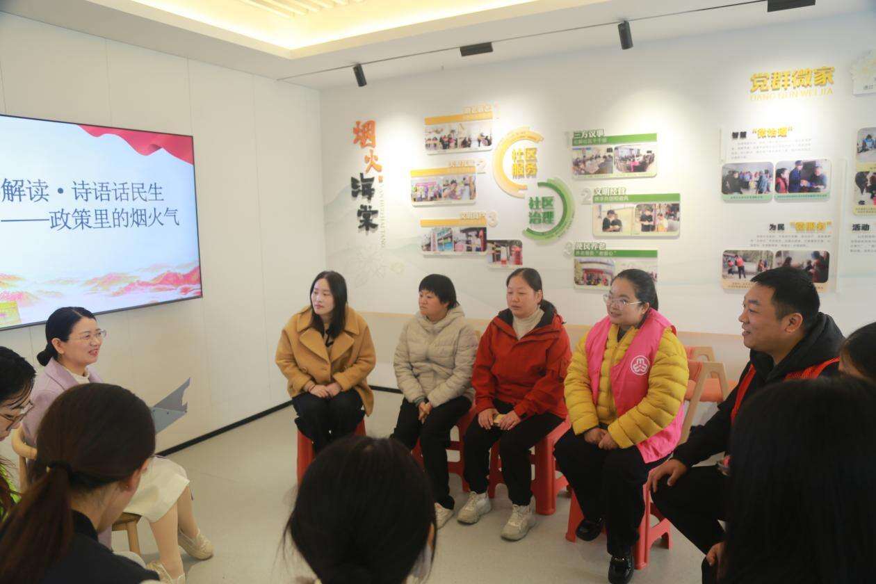 “诗语话民生”环节是本次活动的核心内容。牟茜茜与居民、退役军人代表围坐一堂,以轻松亲切的交流方式,将党的二十届四中全会精神与诗歌内涵相结合,用通俗易懂的语言解读政策要点。她结合社区实际案例,从就业保障、养老服务、环境整治等居民关心的民生话题切入,把“大政策”转化为“小故事”,让大家深刻体会到政策文件中蕴含的“烟火气”与“民生温度”。社区居民林燕感慨道:“这样的解读接地气,我们听得懂、有共鸣,也更清楚了国家的好政策是如何实实在在惠及我们老百姓的。”交流过程中,大家踊跃发言,分享生活变化,提出意见建议,现场互动热烈。