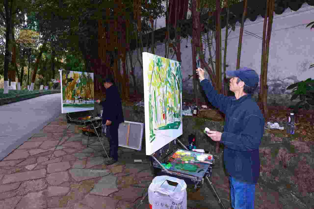 活动期间,美术家们分赴松溪美术馆、中国柑橘博物馆、黄岩石窟、布袋坑村、白鹭湾版画村及九峰公园等多个特色点位开展写生创作。在松溪美术馆,画家们驻足品鉴馆藏精品,循着作品脉络,探寻黄岩本土艺术的发展流变;橘园里,果实挂满枝头,丰收的气息扑面而来,成为天然的创作素材;黄岩石窟斧凿天成的岩壁肌理、千年沉淀的历史痕迹,引发了画家们对自然伟力与人文积淀的深度思考。在屿头柔川景区和布袋山,美术家们支起画架、铺开画纸,以笔墨为媒定格秀丽山水,用画笔尽情抒发对黄岩山水的热爱与眷恋。在黄岩九峰公园,古民居独特的建筑形制、斑驳的墙面肌理与深厚的历史韵味,深深吸引了众人的目光。公园内的植被、亭台楼阁,更像一把钥匙,开启美术家们的创作灵感。
