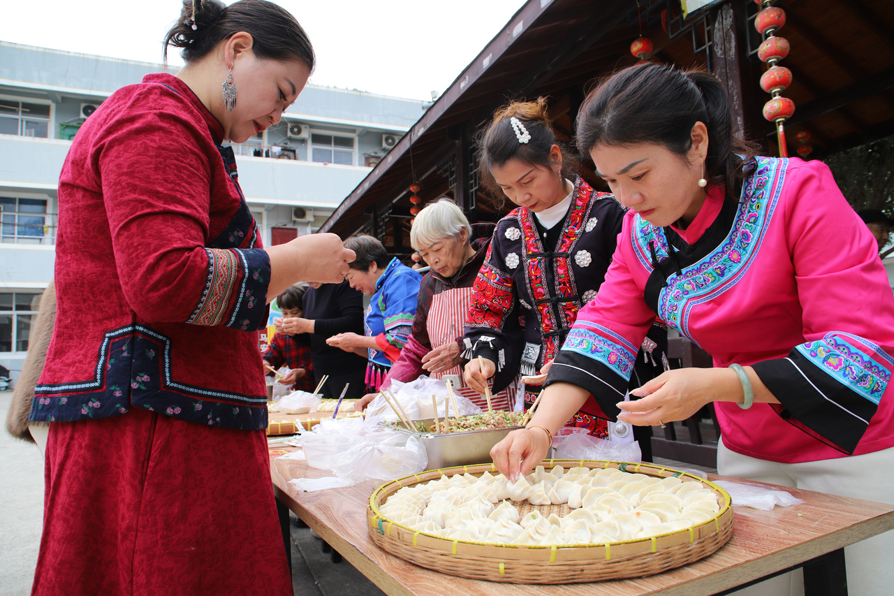 文化礼堂内,早早布置好的长桌旁围满了来自不同民族的居民。大家分工协作,拌馅、擀皮、包捏,动作娴熟、笑语不断。不一会儿,一排排形态饱满的饺子便整齐地排列在盘中。活动中,不少人一边包饺子一边交流着各自家乡的冬至习俗,不同地域的文化在交融中更显生动,现场洋溢着“一家亲”的温暖氛围。