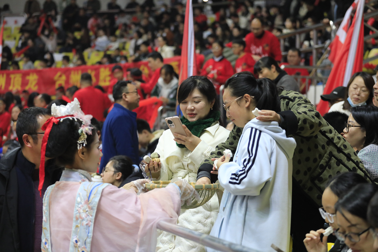 中场休息时,古城临海的特色福利暖心登场,一群身着古装的工作人员现身赛场,为观众送上海苔饼、乌饭麻糍等传统糕点,糯香萦绕、甜意满溢,让激烈的赛场瞬间多了几分烟火温情。