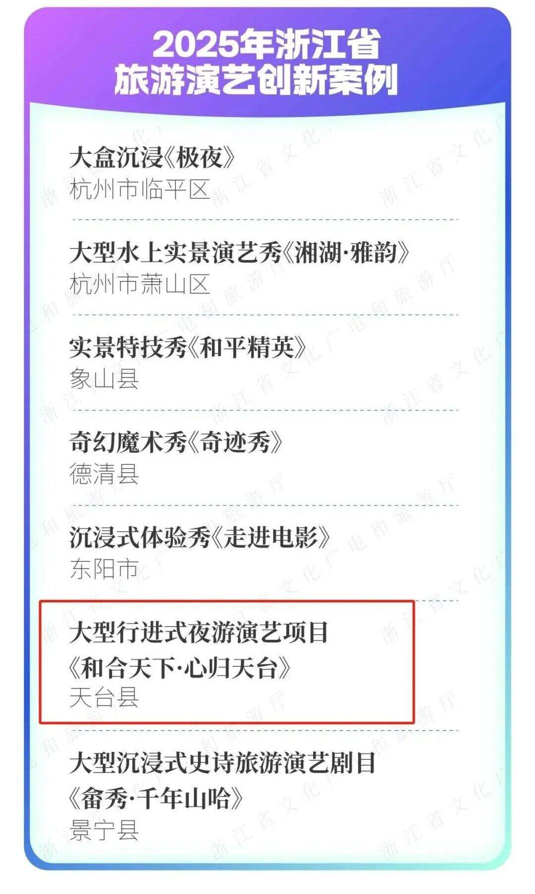近日,省文化广电和旅游厅公布2025年浙江省旅游演艺创新案例,天台县大型行进式夜游演艺项目《和合天下·心归天台》入选。