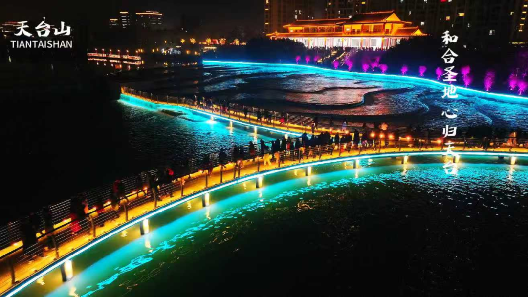 《和合天下·心归天台》是全国首部和合文化主题行进式夜游实景演出,于2024年5月1日正式开演。项目以“和合文化”为核心,依托始丰湖水岸,融合激光水幕、3D投影、歌舞表演与游船同游等形式,打造“人在船中坐、船在画中游”的沉浸式体验。夜游主线全长3.5公里、约50分钟演出,采用“声光电水”多维技术,并配备VIP与普通游船,游客亦可沿湖步行观演。