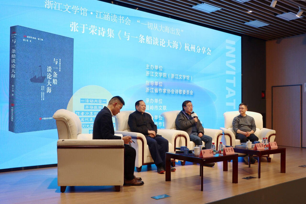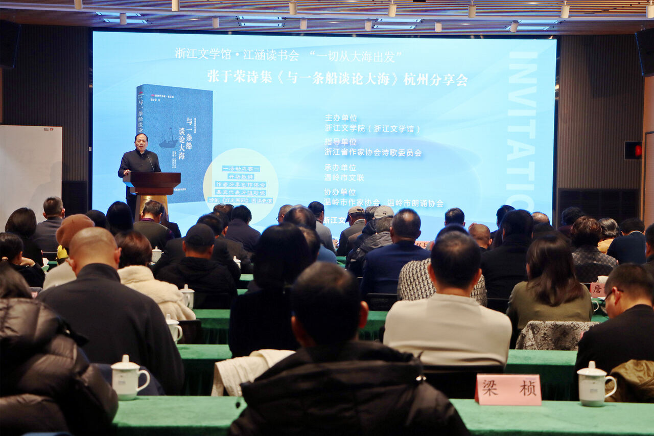 寒冬虽至,浙江文学馆一楼多功能厅里却暖意融融。12月21日,江涵读书会“一切从大海出发”暨张于荣诗集《与一条船谈论大海》分享会在这里举行。中国作家协会会员、新时代海洋诗歌写作的代表性诗人之一、温岭籍诗人张于荣现场分享创作感悟,和诗人、读者们一同探秘东海原乡与新时代诗歌的深邃联结,并与大家展开了一场海洋诗歌世界里充满思想性、启迪味的文学对谈。