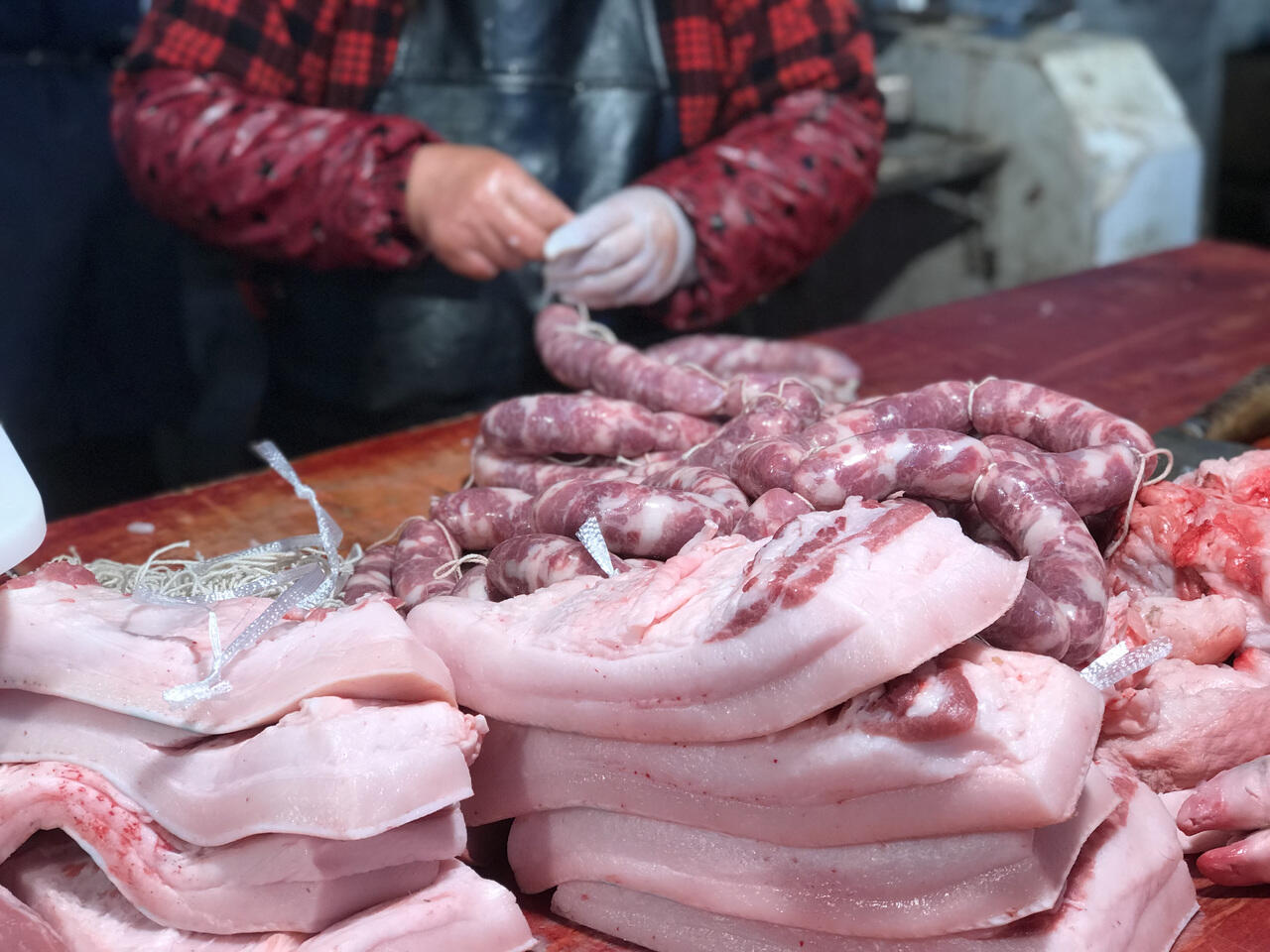 李建华是市场里的“灌肠老手”,每年这个时候都会迎来不少回头客。“我19岁开始卖猪肉,主要做散客生意,本地老顾客多,今年已经做了半个月香肠,基本一天做100来斤,明后天都有订单,按照往年,灌香肠会一直旺到农历十二月初十左右。”