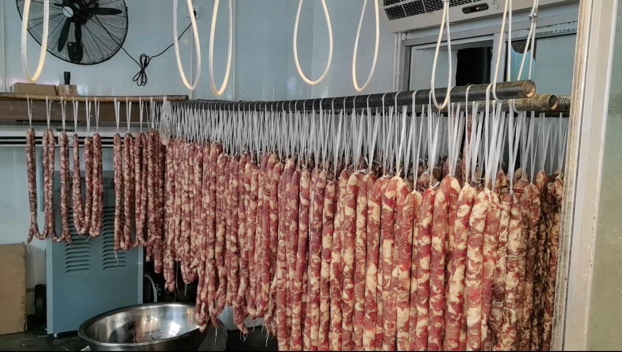 “老板,今天风蛮大的,香肠我拿回去晾干。”当天,在椒江屷崦路的“西门老王肉铺”,一市民将已制作好的10多斤本地香肠带回家。
