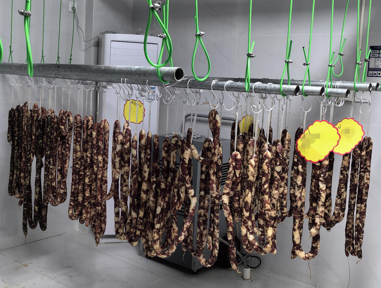 记者看到,猪肉摊前堆满了新鲜的猪肉,供市民挑选,摊位后方则是“风干房”,架子上的香肠正在空调、电风扇等外力作用下风干晾晒中。
