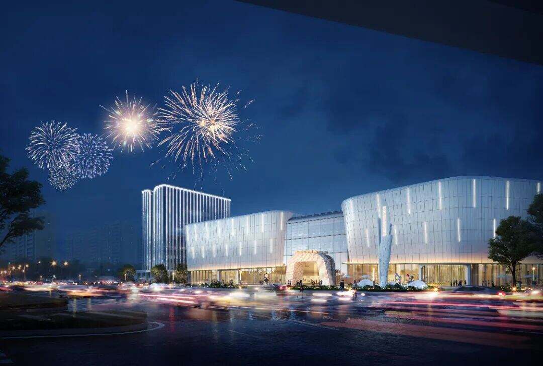 建筑上,项目以白色为主色调、深灰为辅助色、暖黄作点缀,搭配白色金属铝板、low-E超白玻璃等材质,结合弧形造型与光影效果,打造出兼具地域特色与科技感的现代建筑。项目景观按功能分区设计,酒店区以镜面水景营造休闲氛围,市场区则侧重车辆通行与停车便捷性。