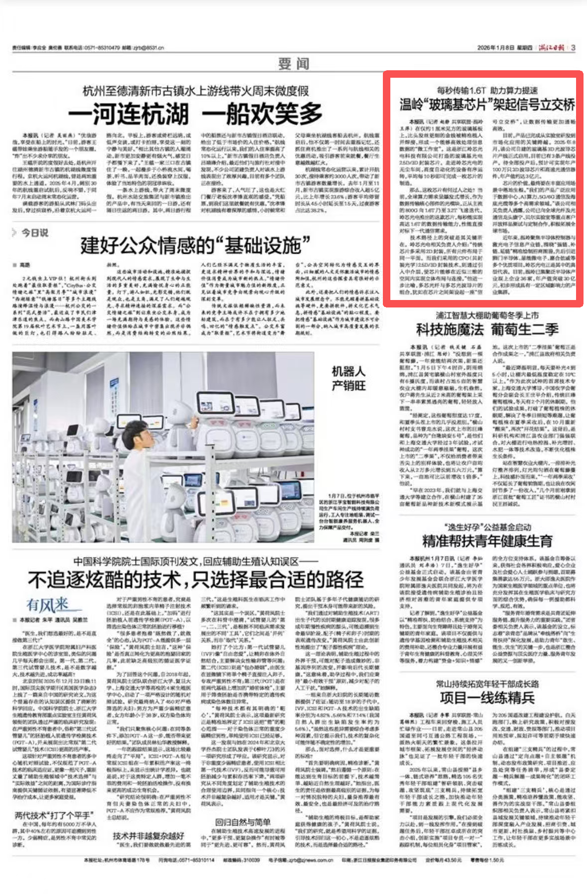 在仅约1厘米见方的玻璃基板上,比头发丝更细的金线被精准植入并焊接,形成一个能够高效处理信息数据的“微工作室”。这是浙江岭芯光电科技有限公司打造的玻璃基光电2.5D/3D封装芯片。走进岭芯光电的无尘车间,高度自动化的设备有序运转,平均每10秒即可完成一枚芯片的制造。