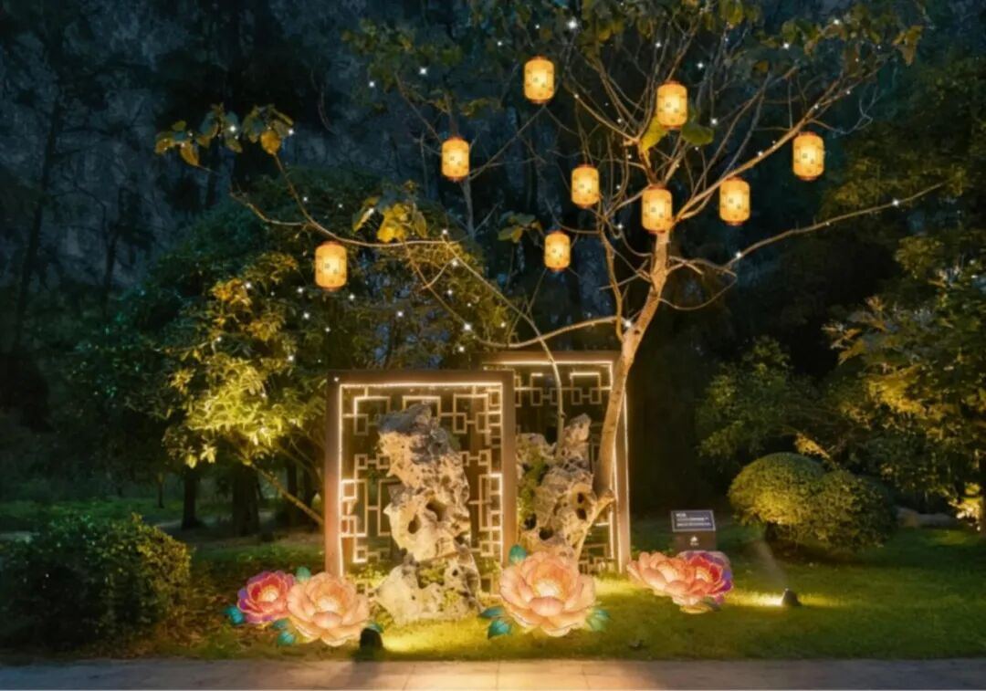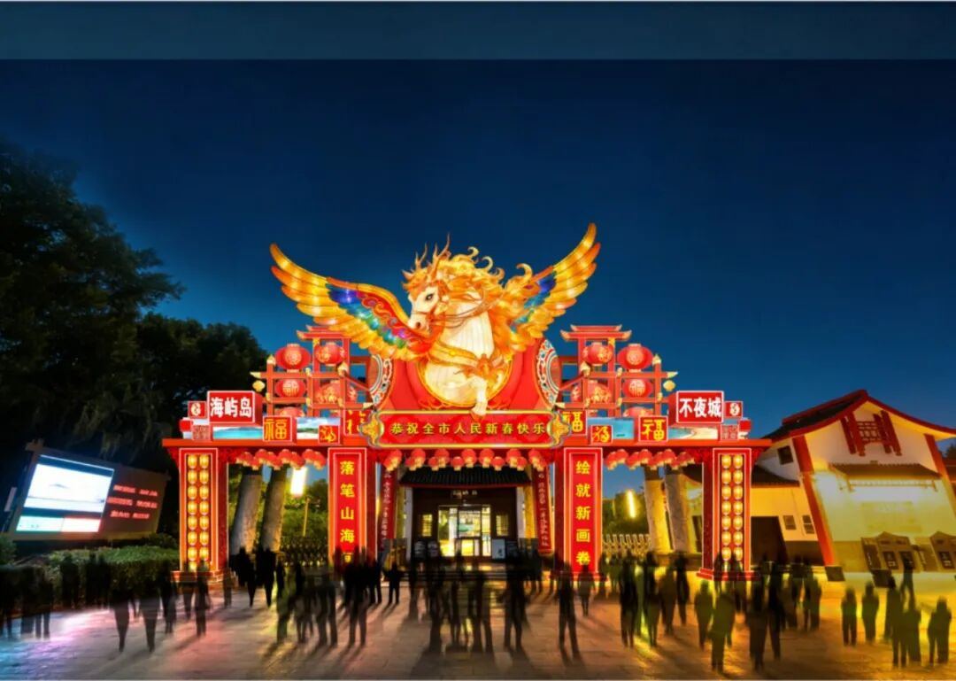 12米高的 “一马当先” 灯组昂首迎客,红火灯笼与鎏金灯带点燃新春氛围。