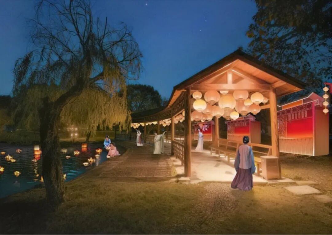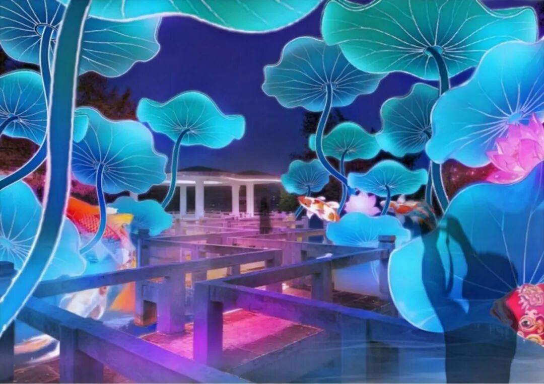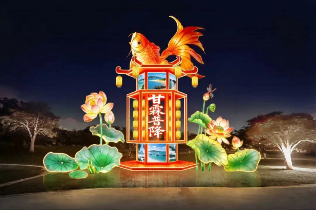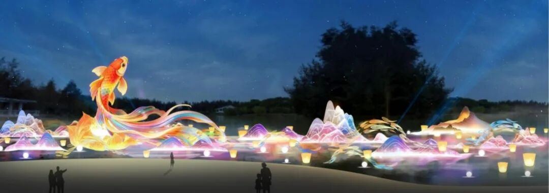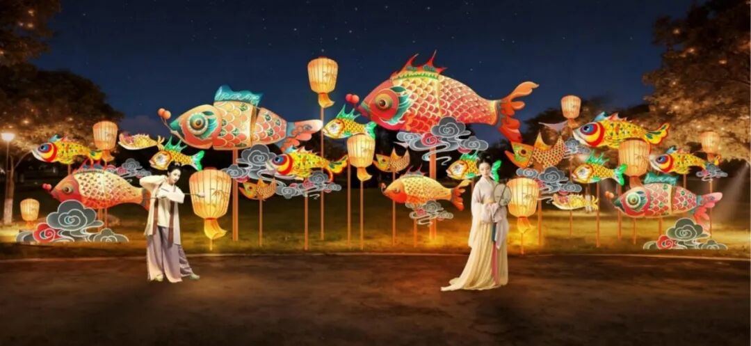 30米长的“沧屿仙姬”灯组立于水域之上,仙姬伴珊瑚贝珠相生,水映灯、灯映浪,步步皆裹碧海祥瑞,步步皆蕴洋屿吉光;40米长的 “锦鲤流光” 灯组由千万缕流光编织而成,红橙黄绿的渐变色彩如鳞光跃动,恰似 “鲤鱼跃龙门” 的祥瑞写照;灯桥之上宫灯罗列,行走其间仿佛穿越千年宋韵水驿。