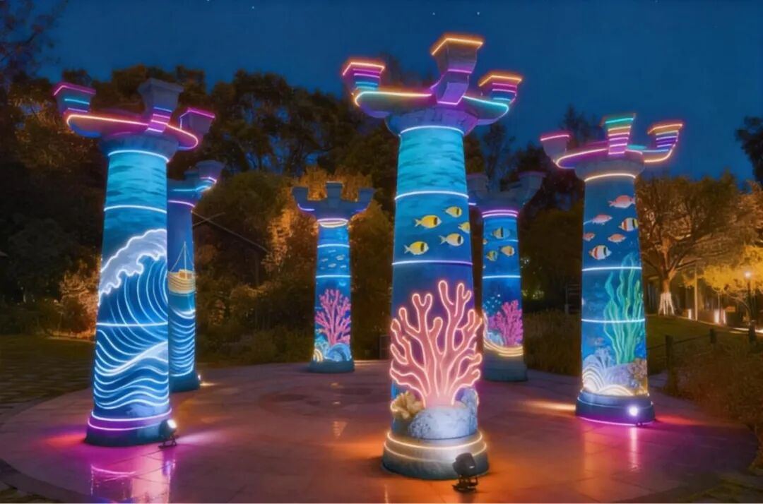 “华柱夜宴”:海浪、鱼群、珊瑚等海洋图景,打造沉浸式夜游景观。