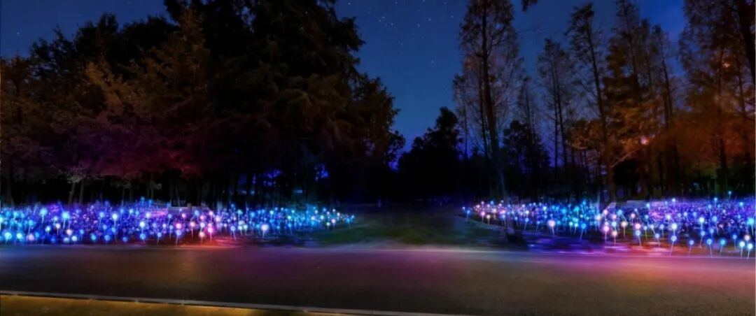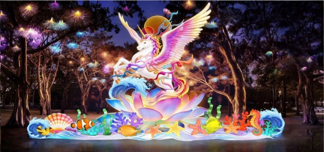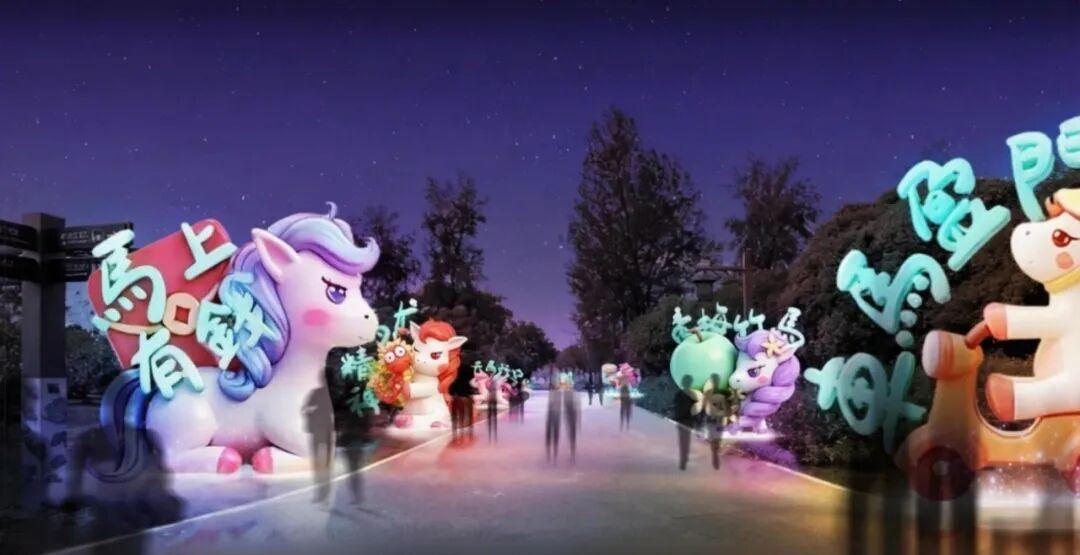 “星羽天马” 流光溢彩,羽翼如星瀑倾泻,带你闯入奇幻梦境;千根地插灯打造的 “星野萤梦”,林间萤火点点,治愈感拉满;萌趣小马灯组散点排布,搭配 “马上有钱” 趣味文字,成为亲子互动打卡的绝佳选择,让科技与童趣碰撞出别样火花。