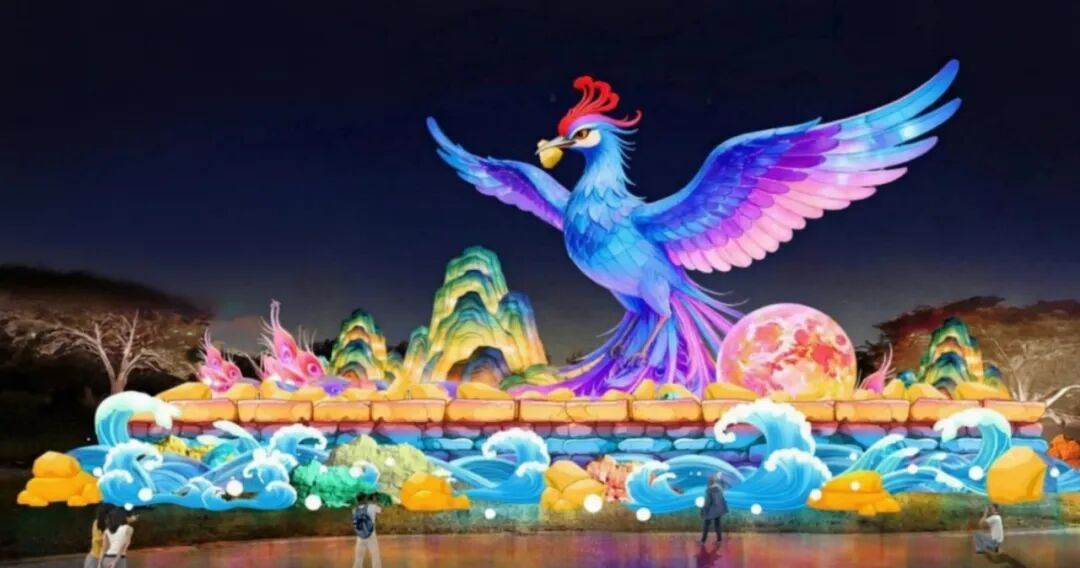 25米长的 “精卫护佑” 灯组重现神话韵味,海浪山石间藏着坚韧执着的美好寓意。