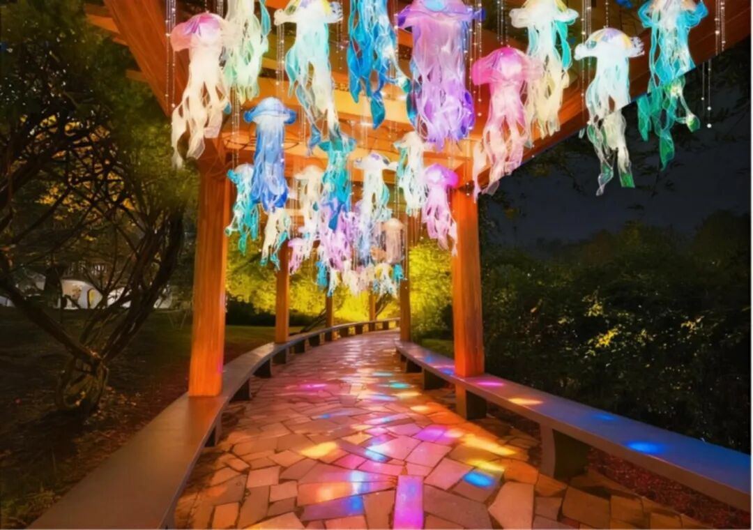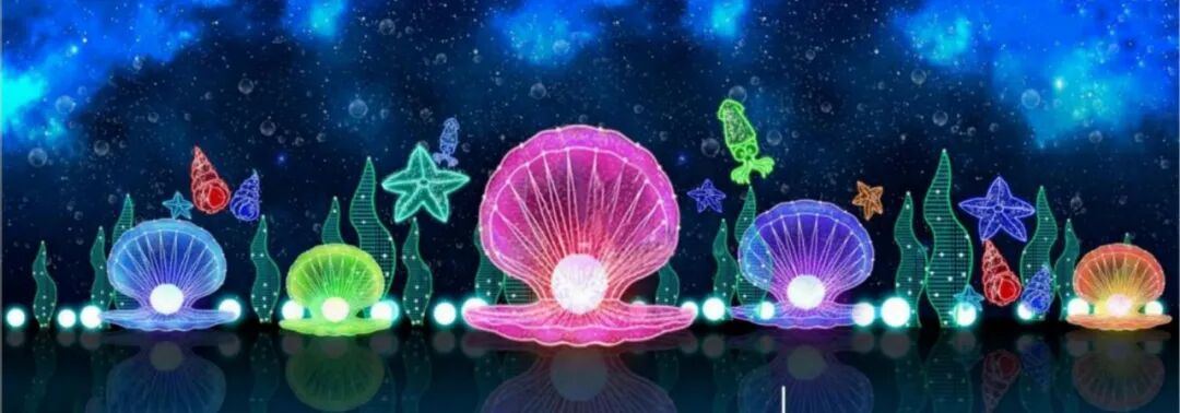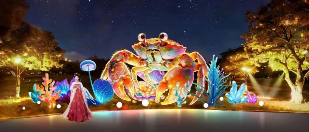 “彩蟹呈祥”“闪耀珍珠” 灯组将海底世界搬至陆地,珊瑚、海螺与光影交织,打造童话般的奇幻场景。