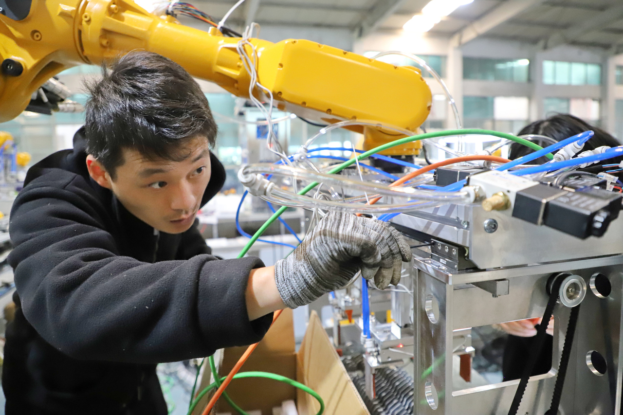 图为公司技术人员正在调试机器人设备。