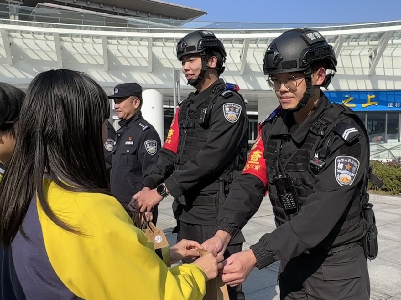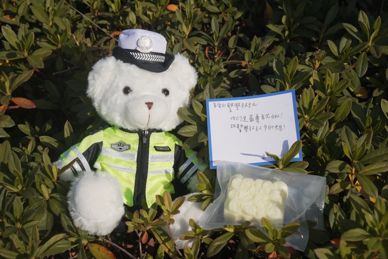 现场民警向同学们回赠了警察小熊玩偶,在一来一往的互动中,温暖悄然传递。