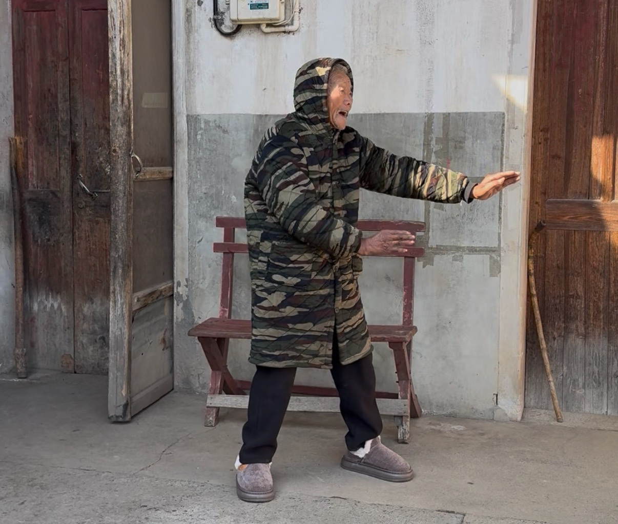 孙尚营告诉记者,除了下地干活,老人最喜欢舞狮和打拳。大抵是听到了“打拳”二字,老人兴奋地向大家展示起来,一边出拳,一边喊着铿锵有力的口号,一招一式,尽显勇武。展示结束,老人兴冲冲说起年轻时打拳的趣事,虽然已经年过百岁,但这些往事,他还能够清楚地回想起来。