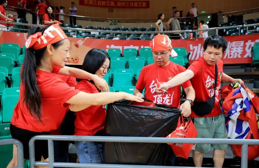 啦啦队员陈女士掏出随身携带的垃圾袋,将座位上的应援棒、空杯子一一拾起。“随身带垃圾袋已成为我们无声的约定。”