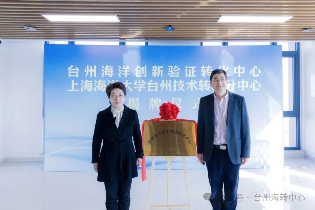 仪式现场,杨玲玲、朱坚为台州海洋创新验证转化中心揭牌,罗轶、朱坚为上海海洋大学台州技术转移分中心揭牌。