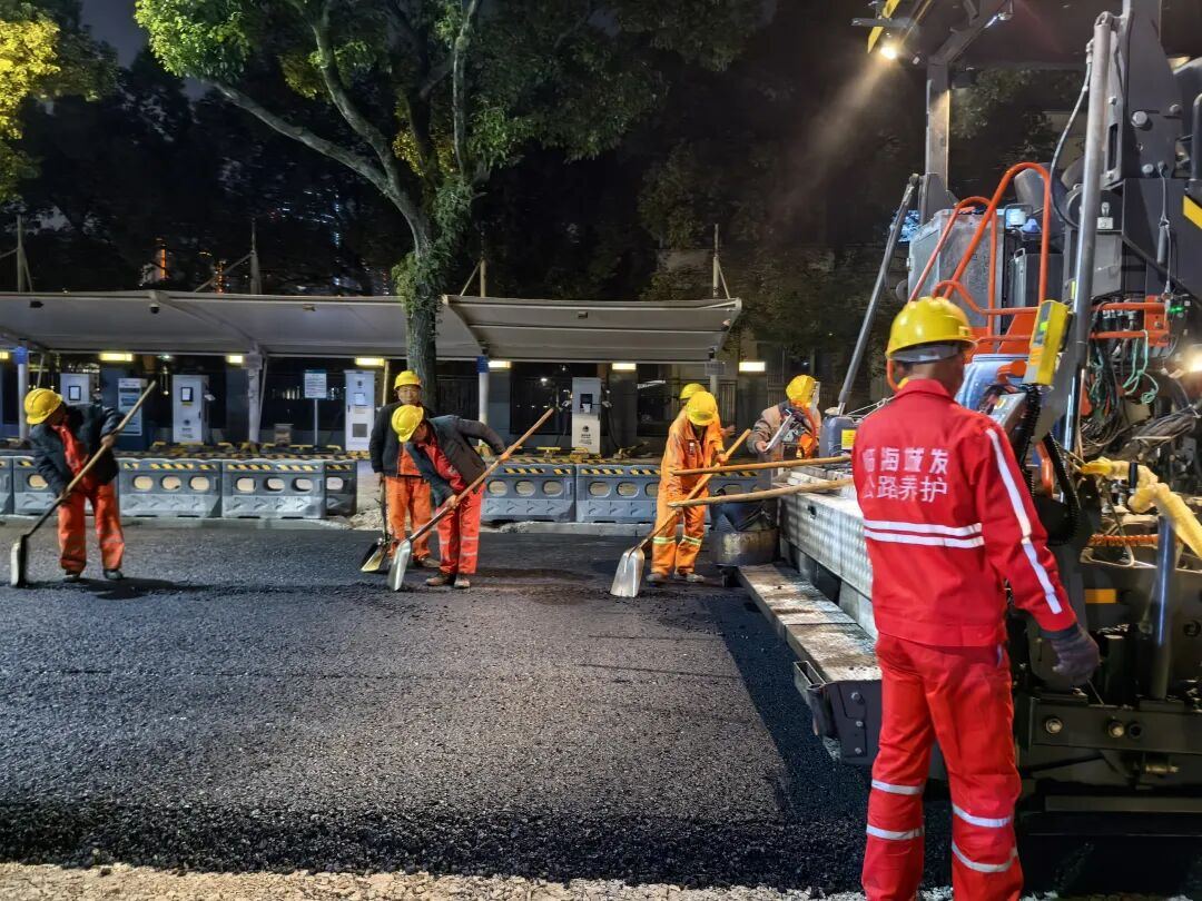在凯歌路施工现场,沥青摊铺机缓缓前行,将滚烫的沥青均匀地铺设在破碎后的路基上,压路机紧随其后来回碾压,将新铺设的沥青路面压实压平。整个施工流程衔接紧密,一气呵成。