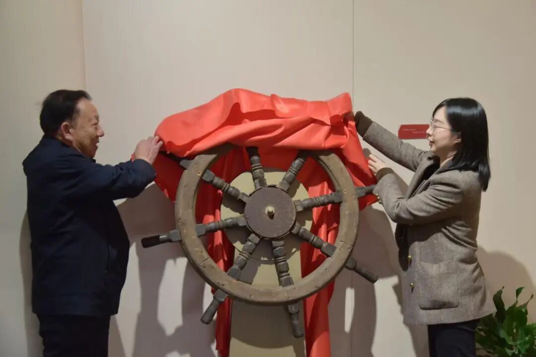 在“人民群众踊跃支前”专题展区,本次捐赠的重要实物之一的一江山岛战役期间金寿兴烈士同款船舵被揭幕。斑驳厚重的船舵上,岁月痕迹清晰可见,它既是当年沿海民众支援前线的重要工具,更是军民同心、共克时艰的珍贵见证。此次捐赠的还包括战役纪实、英雄事迹等相关书籍,将进一步充实馆藏红色读物资源,为青少年红色教育提供丰富素材。