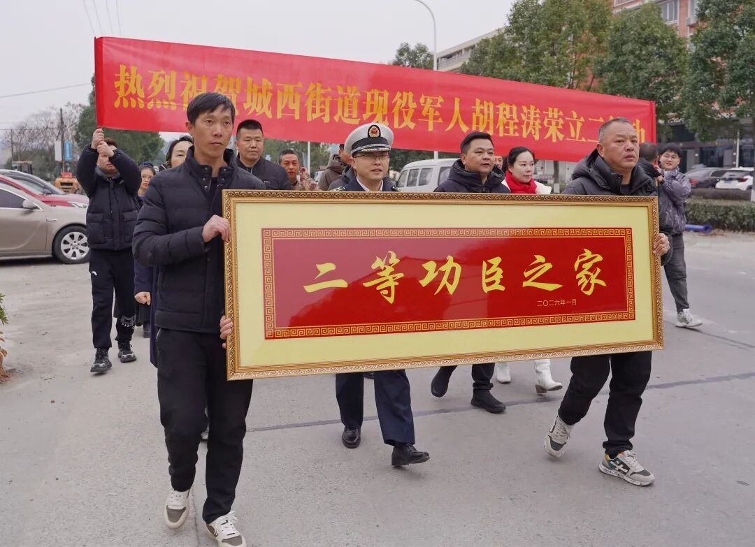 二等功臣之家牌匾与二等功喜报如期送达胡程涛及其家属手中,邻里乡亲闻讯齐聚,共同见证这一属于军人家庭的荣耀时刻。