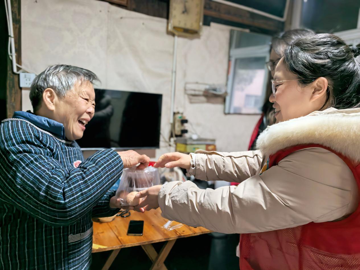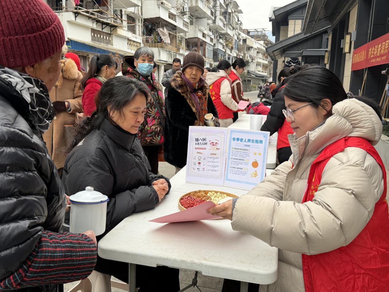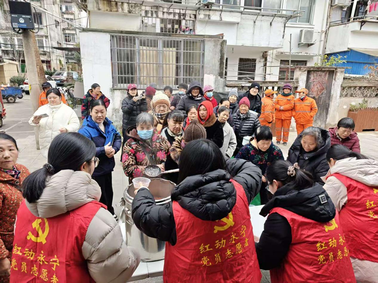 塔苑社区、王林洋社区、海棠社区携手发力,组织 Ta 苑微光志愿者、半岛志愿者、烟火海棠等志愿者队伍,分两处同步开展腊八主题活动。王林洋社区以“‘腊’么有趣・年味腊八”生活集市形式热闹开场,志愿者们将精心熬制的腊八粥递到居民手中,软糯香甜驱散冬日寒凉。志愿者们还化身“民俗讲解员”,为居民详解腊八节的起源与文化内涵,邀请大家用方言吟诵古诗,回味传统韵味。集市上,爱心义剪、健康测量等便民服务贴心周到,趣味套圈游戏更是吸引男女老少踊跃参与,邻里间欢声笑语不断。塔苑社区则以“‘Ta’心同守迎腊八,一碗热粥暖万家”为主题,志愿者们不仅为过往居民、环卫工人送上热粥与祝福,还组建上门服务小队,带着腊八粥和慰问品走访空巢老人,陪老人谈心、整理房间,用实际行动让独居老人不再孤单。