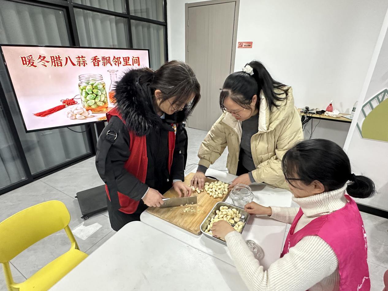 王西社区与东浦社区共同举办“暖冬腊八蒜,香飘邻里间”主题活动,社区活动室里暖意融融,早已盖过冬日寒气。长桌旁坐满了街坊邻里,穿粉色志愿服的张阿姨分享着自己泡了十年腊八蒜的“秘方”,几位常一起跳广场舞的阿姨一边分拣蒜瓣,一边相约腊八节的饺子局。从选蒜、去蒂到装罐、淋醋,居民们在动手操作中畅谈家常,把生疏聊成熟稔,把客套换成真心。当透亮的米醋没过雪白的蒜瓣、拧紧瓶盖的瞬间,大家纷纷畅想蒜瓣变绿后的“品鉴会”,盘算着“腊八蒜配饺子”的美味菜单。这一罐罐待发酵的腊八蒜,承载着老习俗的年味儿,更积攒着社区里热乎乎的邻里情。