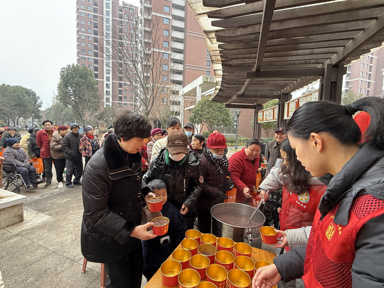 五里牌社区开展 五里里同温一粥暖 睦里情长腊意浓” 主题活动,志愿者精选糯米、红枣、红豆、莲子等八味食材,经三小时文火慢熬,熬制出营养心意意兼具的腊八粥,为居民、环卫工人、快递员、外卖员等群体递上热粥;同时组建 “流动送粥” 志愿服务队,上门慰问老党员、独居老人、残障人士等特殊群体,实服务务精准覆盖五里