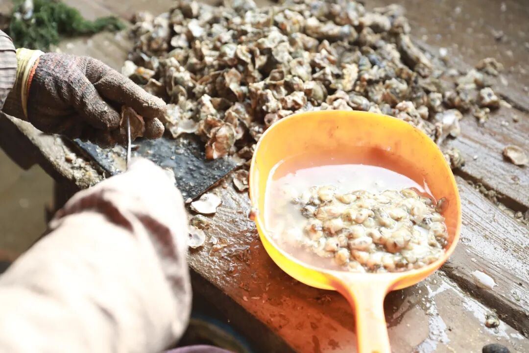 走进铁强村的牡蛎加工厂,门口堆叠如山的牡蛎壳映入眼帘。车间里,工人们分工有序,撬壳、取肉、分拣,动作娴熟利落。一颗颗饱满肥嫩的牡蛎肉很快便装满容器,透着诱人的光泽。“这些都是很早从滩涂采的,我们两三点就开始干活了,得赶紧处理才能保证鲜度。”养殖户吴香阳一边麻利地处理刚采收的牡蛎,一边向记者介绍。