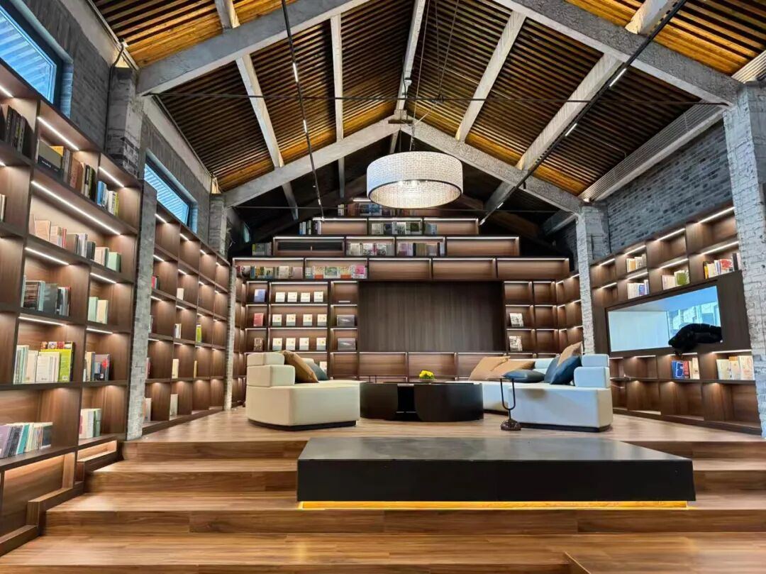 “楽在”书屋由印刷厂一栋仓库改造而成,书屋内,原厂房的砖墙裸露在外,与四面书籍围合出静谧的阅读场域。顺着台阶,人们可以从书架上挑选一册自己喜欢的书,在木质台阶上席地而坐,或窝在沙发上翻阅。书屋内还展陈了两块铭文砖,它是仓库改造时挖到的,展示着这座书屋的过去。
