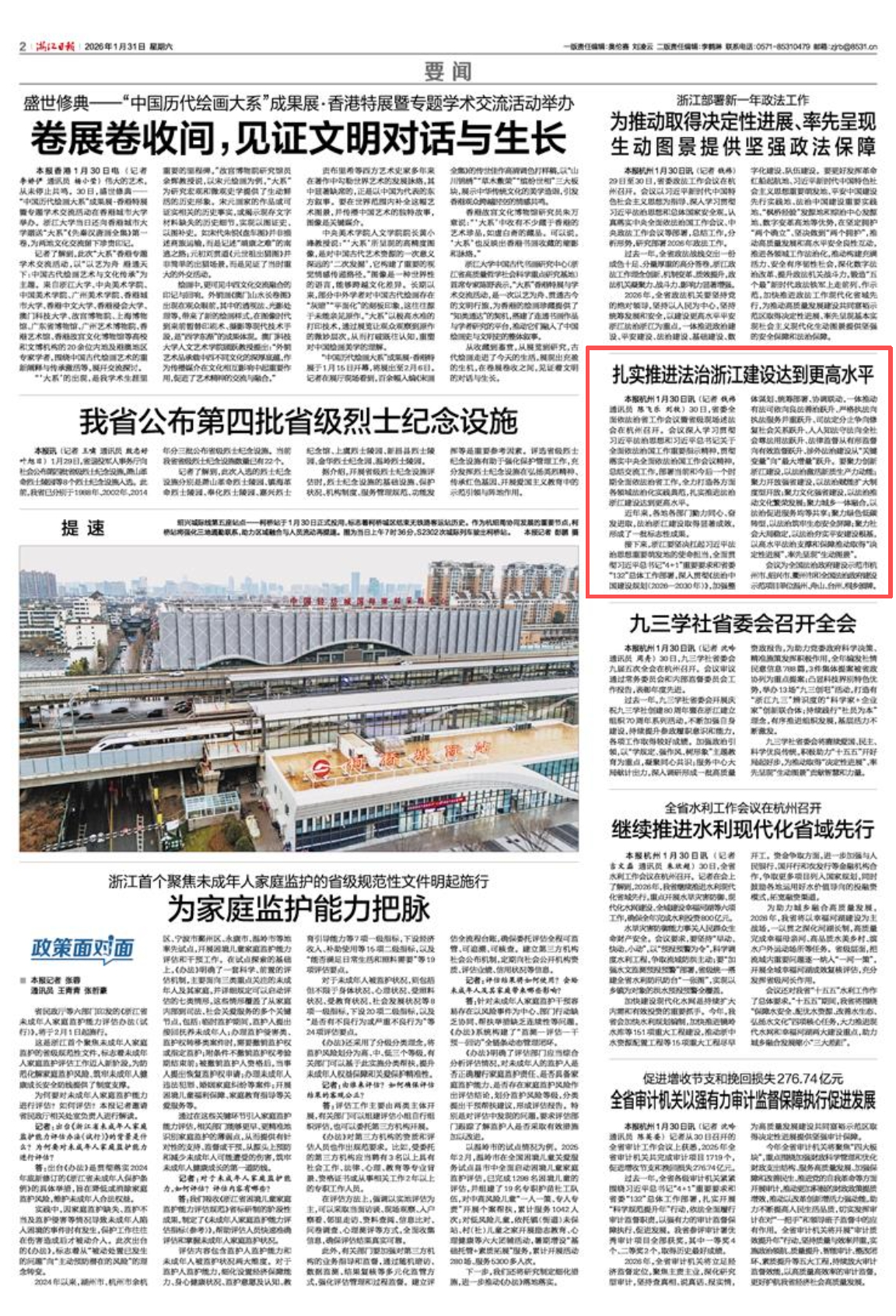 接下来,浙江要坚决扛起习近平法治思想重要萌发地的使命担当,全面贯彻习近平总书记“4+1”重要要求和省委“132”总体工作部署,深入贯彻《法治中国建设规划(2026—2030年)》,加强整体谋划、统筹部署、协调联动,一体推动有法可依向良法善治跃升、严格执法向执法服务并重跃升、司法定分止争向修复社会关系跃升、人人知法守法向全社会尊法用法跃升、法律监督从有形监督向有效监督跃升、涉外法治建设从“关键变量”向“最大增量”跃升。要聚力创新浙江建设,以法治激活新质生产力动能;聚力开放强省建设,以法治赋能扩大制度型开放;聚力文化强省建设,以法治推动文化繁荣发展;聚力城乡一体融合,以法治促进服务均等共享;聚力绿色低碳转型,以法治筑牢生态安全屏障;聚力社会大局稳定,以法治夯实平安建设根基,以高水平法治支撑和保障推动取得“决定性进展”、率先呈现“生动图景”。