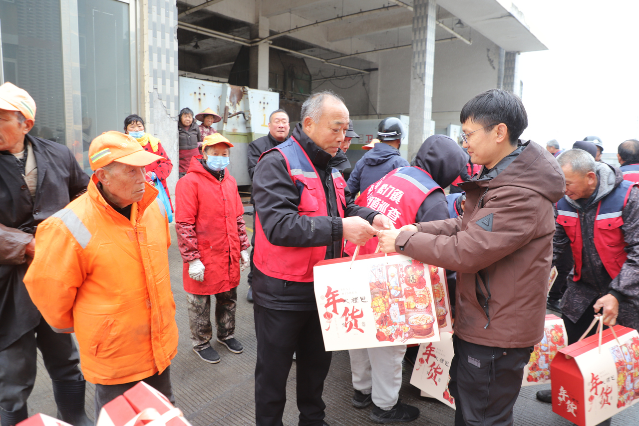图为松门镇商会在环卫所里为环卫工人、河道保洁员送上年货大礼包。