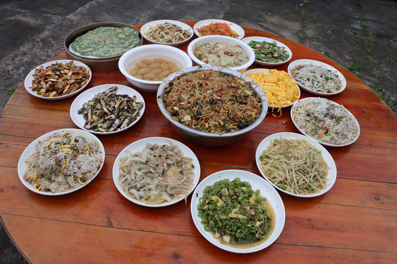 与制作麦饼、烧馅料相比,包麦饼筒绝对是一门考验技艺的活。在一切就绪后,大家围拢在一张圆桌上,桌面摆着各式的馅料,有洋葱,有豆腐干炒猪肉,有绿豆芽丝……天上飞的、地上跑的、海里游的、土里长的,应有尽有。