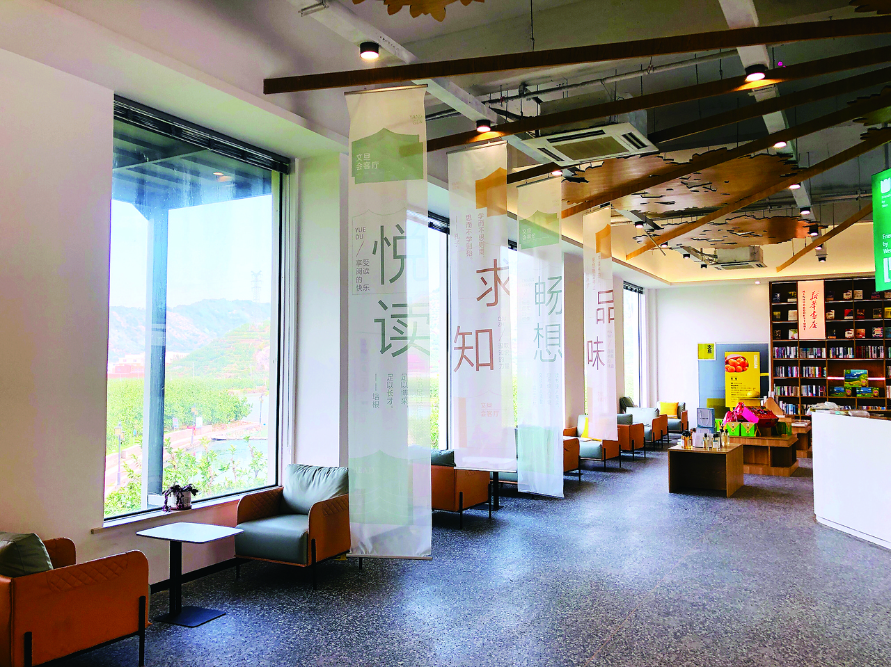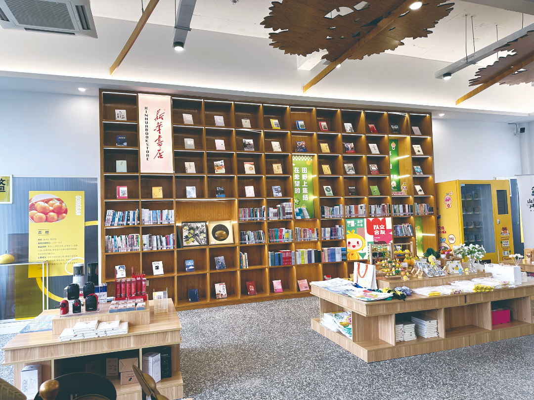一楼像一个巨大的书房兼展览馆。靠窗摆着软和的沙发,边上是一整墙的书架,构成了与新华书店合作的新书阅读区。书架上定期更新的书籍琳琅满目,从文学、科学、地理等通识读物,到农业技术、果品知识等实用手册。